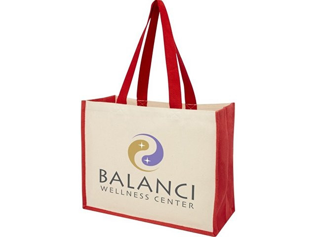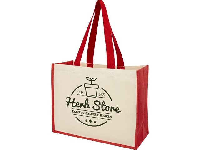 Расчет нанесенияМодная сумка для покупок с боковыми панелями (вес 320 г/м²), подходящими для нанесения изображений, окантовкой из ламинированного джута и хлопковыми ручками.