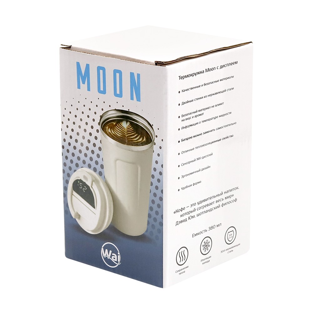 Термокружка Moon с дисплеем выполнена из пищевой нержавеющей стали. Имеет двойные стенки с вакуумной изоляцией, а крышка изготовлена из пищевого безопасного для человека пластика. Термокружка Moon не только сохраняет ваши напитки горячими, но и показывает температуру напитка! Уникальная особенность данной термокружки – наличие сенсорного индикатора температуры, расположенного в крышке. Чтобы узнать температуру напитка внутри кружки, достаточно прикоснуться к поверхности крышки. Работает от 1 батарейки типа CR2032 (в комплекте), которую в последующем можно самостоятельно заменить.