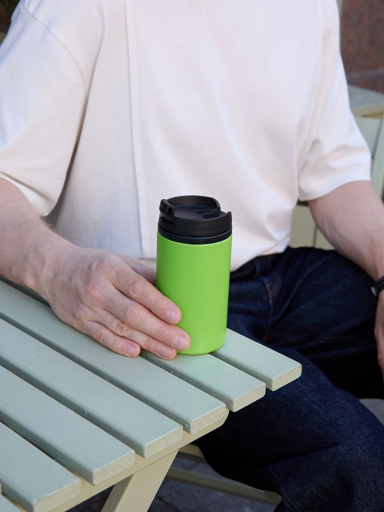 Двухслойная конструкция из пищевого пластика внутри и нержавеющей стали снаружи. Герметичная завинчивающаяся крышка с откидным клапаном для питья.