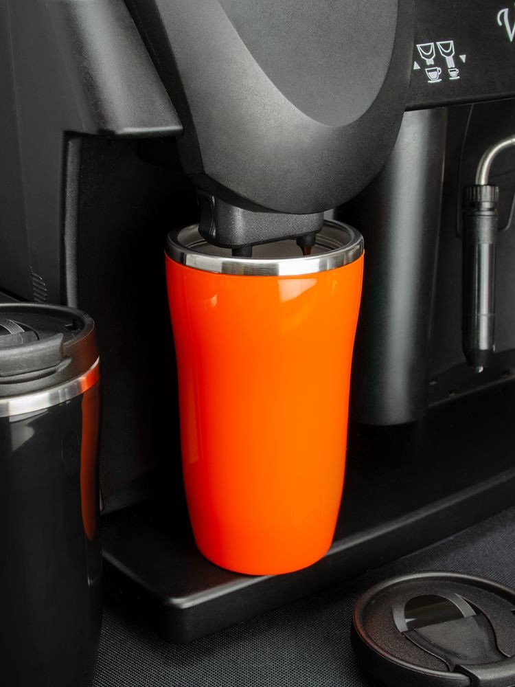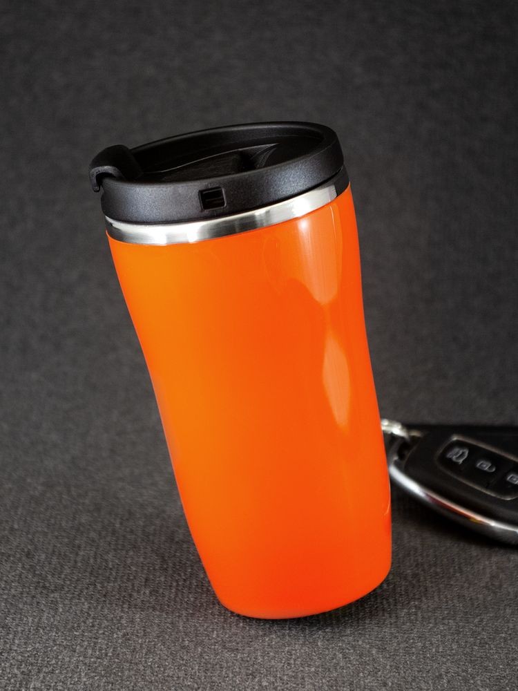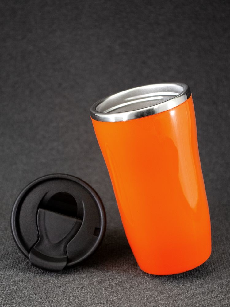 Двухслойная конструкция из пластика снаружи и пищевой нержавеющей стали внутри. Герметичная завинчивающаяся крышка с откидным клапаном для питья. В отверстие в крышке можно вставить шнурок для удобного ношения стакана на руке. Шнурок в комплект не входит.