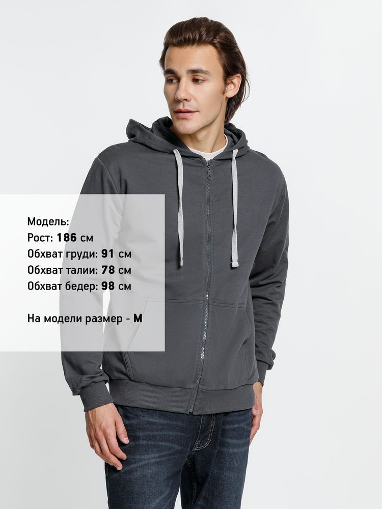 Капюшон на подкладке Молния в тон изделия Два передних кармана Манжеты и низ изделия выполнены резинкой 2х2 Утягивающий шнур серого цвета в капюшоне В шве горловины только бирка с размером Внутренняя сторона без начеса Допускаются отклонения в 5% от указанных параметров по размеру и цвету