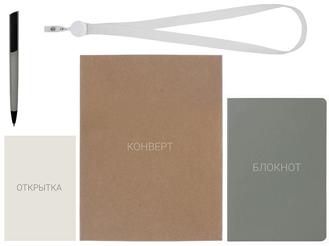 блокнот - искусственная кожа, открытка - бумага, пакет - картон, ручка - пластик с покрытием soft-touch, ланьярд с ретрактором - полиэстер, металл, пластик.